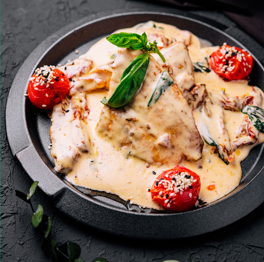 Timianstegt kalkunbryst med pasta og grøntsager